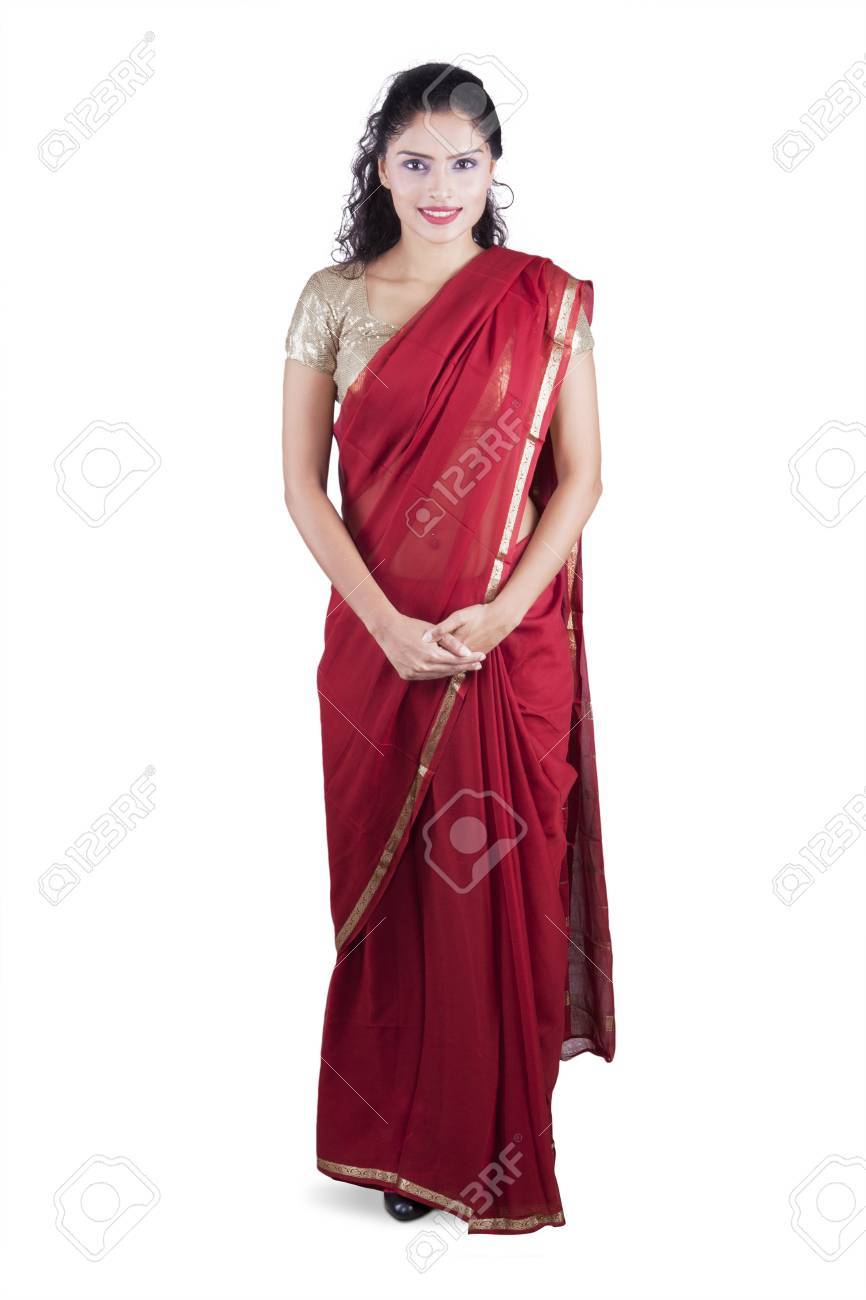 How To Wear A Saree To Look Slim And Tall Tips And Tricks - Indian woman wearing a red saree in studio stock image.
